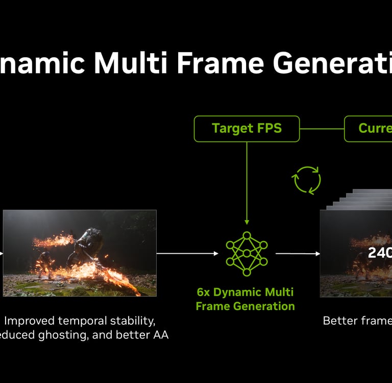 A proposta da Geração Dinâmica de Múltiplos Quadros é adaptar automaticamente o desempenho à taxa de atualização do monitor. O exemplo utilizado um display de 240 Hz, por exemplo, não há necessidade de ultrapassar os 240 FPS. Em situações normais, selecionar manualmente um fator MFG 4x pode gerar quadros em excesso. Atualmente, no entanto, a troca dinâmica entre esses fatores ainda não é feita de forma automática.